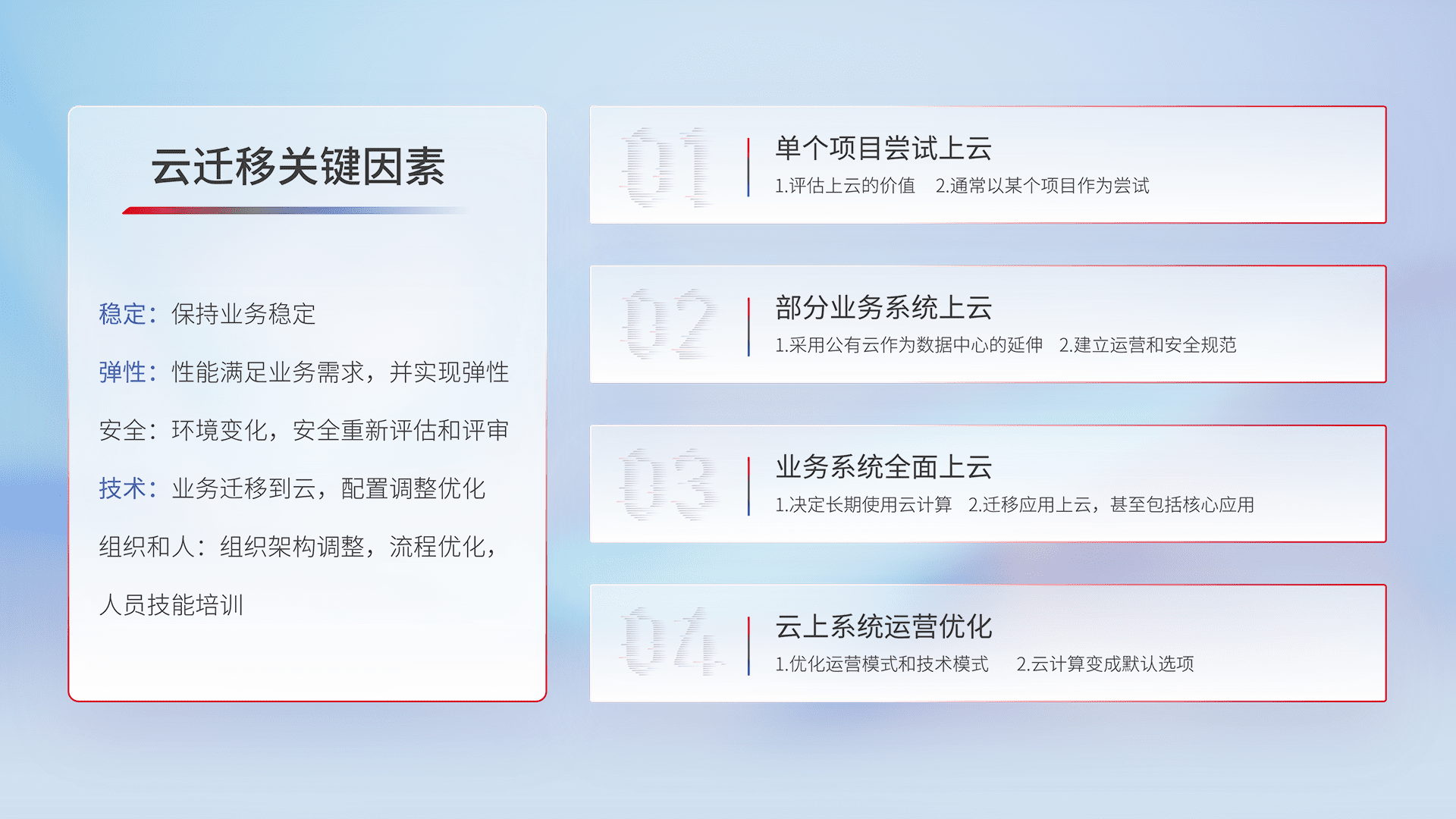 结合实际业务,,从规划设计、、、云平台选型、、、、云原生改造、、数据迁移、、、集成交付,,,,迁移全过程为客户识别最佳上云路径,,,,做好风险识别管理,,,,设计网络架构、、、身份权限、、、、安全审计合规、、、、操作审计、、日志审计、、监控告警策略、、多站点容灾设计等,,,,对云上基础设施进行整体规划,,,,提升IT治理水平,,,,以满足弹性、、高可用、、、高性能的需求。。。