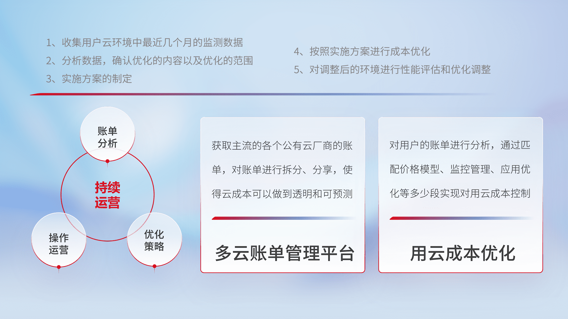 通过多云纳管,,以统一的资源数据模型把客户的云资源进行抽象和封装,,,进而实现对多云资源的统一操作,,保障云资源管理的可靠性、、、、稳定性与可用性。。。量身定制化运维内容,,,配置、、开发运维、、补丁管理、、、备份、、、、监控、、、、认证和访问管理、、审计和日常巡检等,,,保障在用云过程中的可靠度,,稳定度以及高可用率。。。